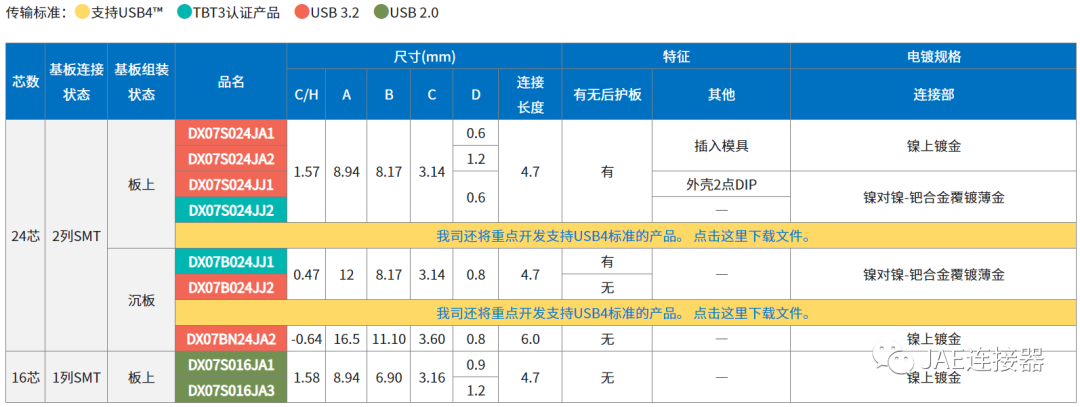 Type-B的产品, Type-C逐渐被应用在越来越多的产品上面.日本航空电子工业(JAE)推出了基于USB 3.2 Gen 2 x2(20Gbps),Thunderbolt3™(40Gbps)的高速传输到 USB 2.0低速传输充电用的Type-C连接器产品系列, 广泛满足各种电子产品的规格要求。另外我们目前正在开发符合USB4™标准的连接器。日本航空电子工业(「航空电子工业」)作为全球领先的连接器制造商, 从初始阶段一直深度参与相关标准的制定, 力求满足客户的广泛需求并提升设备及电路板的设计自由度。
